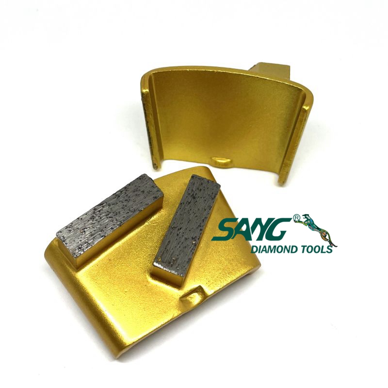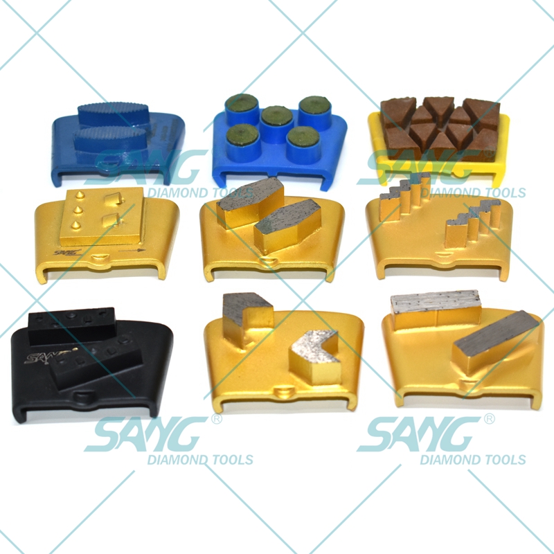 Essas sapatas de esmerilhamento normalmente têm um segmento de diamante ligado a resina ou metal na parte inferior, que esmerilha e poli a superfície do piso. Os segmentos vêm em vários tamanhos de grão, permitindo atingir diferentes níveis de lisura ou rugosidade da superfície, dependendo de suas necessidades.